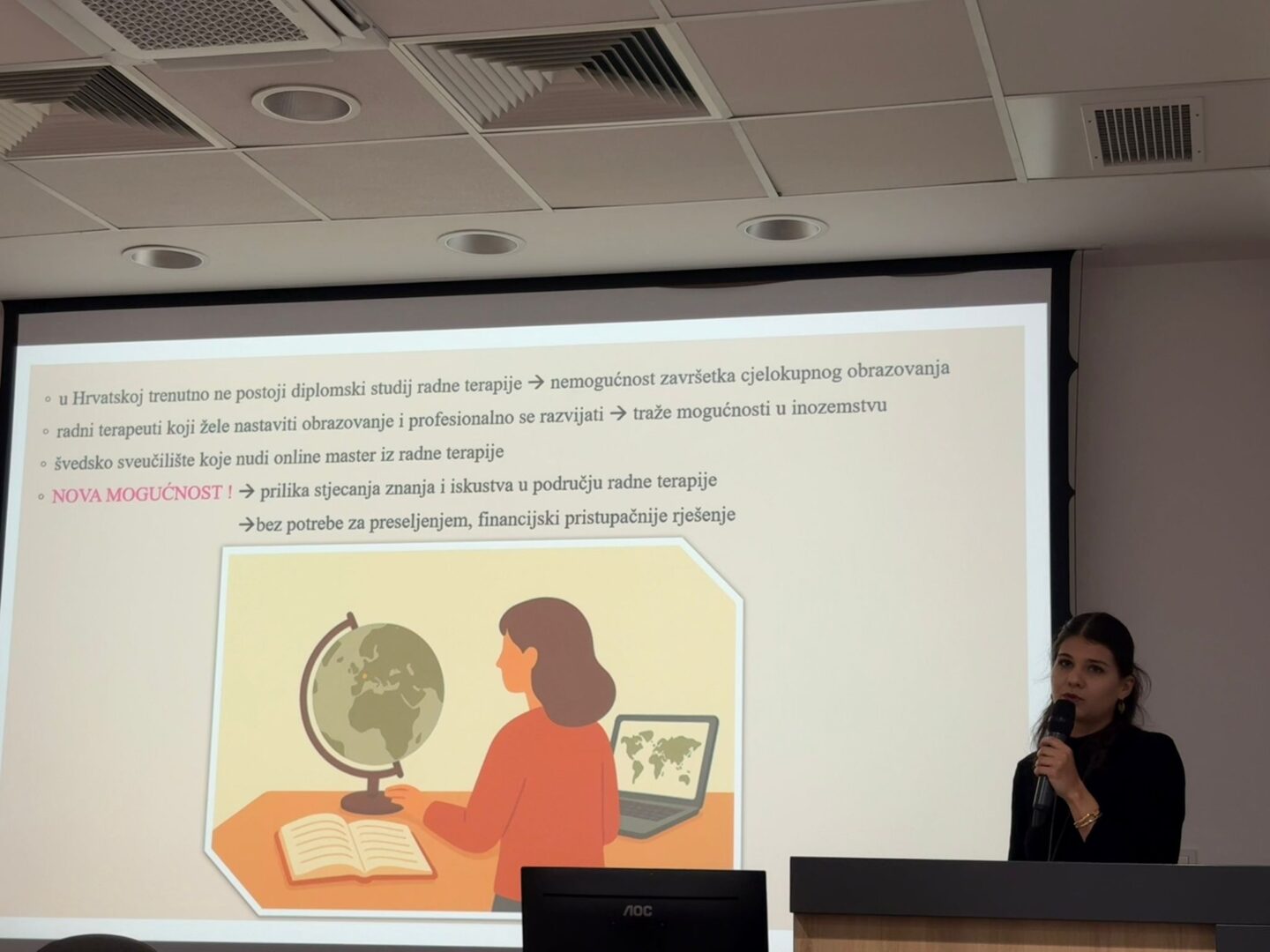 Ispred Katedre za radnu terapiju održano je plenarno predavanje koje je prikazalo rezultate istraživanja o profesionalnom identitetu radnih terapeuta, profesionalnom razvoju i zadovoljstvu poslom. Istraživanje su provele naša nastavnica dr. sc. Andreja Bartolac te kliničke mentorice Tihana Beinrauch, bacc.therap.occup. i Zrinka Delija, bacc.therap.occup..
