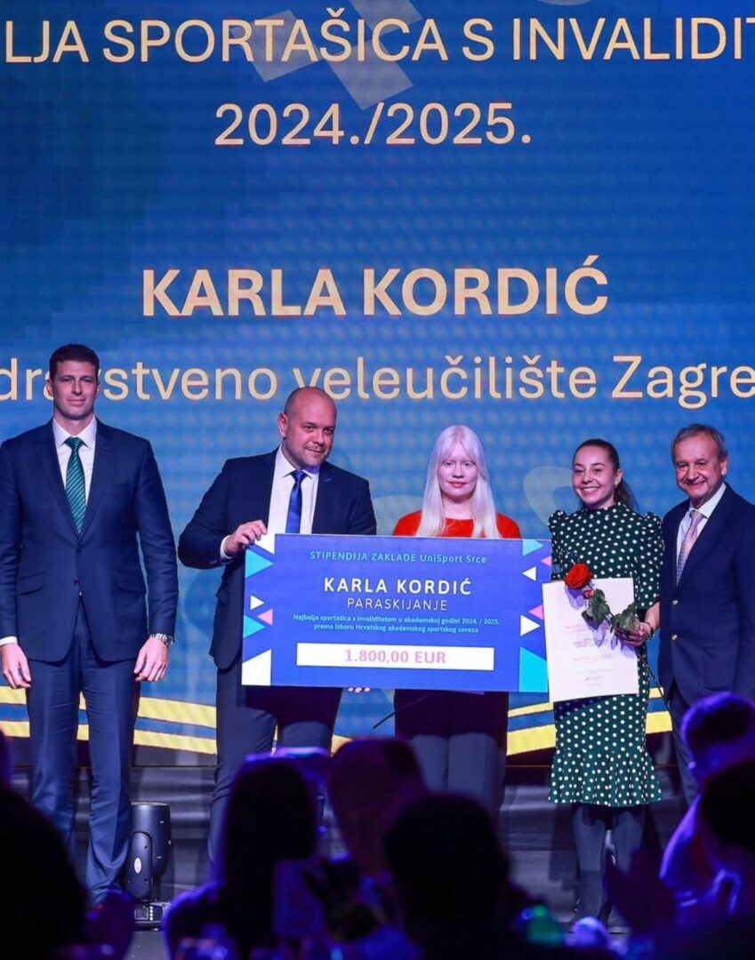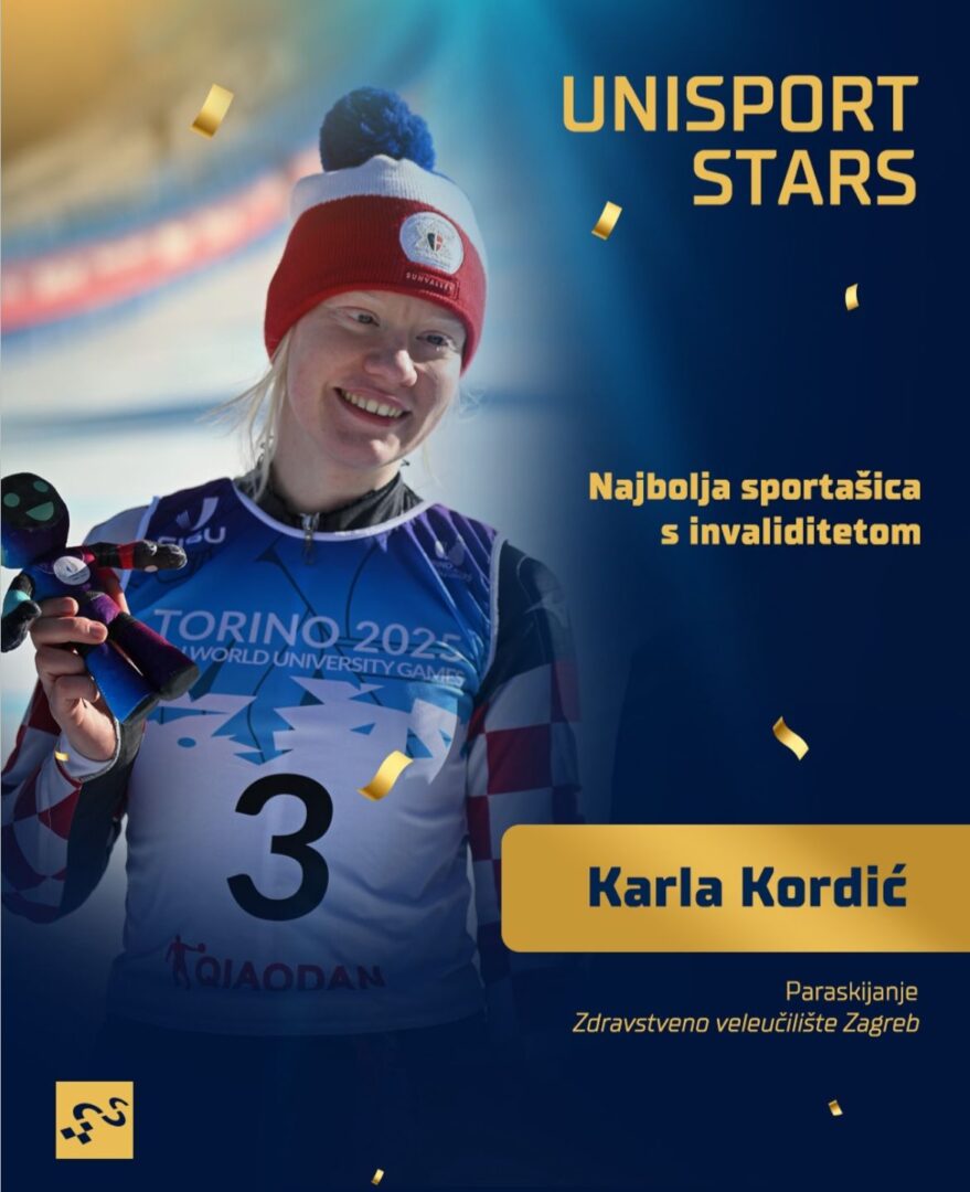 Karla Kordić, studentica Fizioterapije, primila je priznanje za izvanredan sportski uspjeh. Karla je osvojila brončanu medalju na Zimskim svjetskim sveučilišnim igrama 2025., u Torinu, disciplina veleslalom za slijepe i slabovidne, što predstavlja prvu medalju u povijesti za Hrvatsku na ovom natjecanju. Njezina upornost, predanost i rezultati predstavljaju inspiraciju cijeloj akademskoj zajednici.