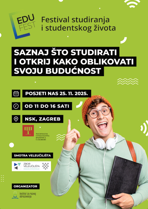 Institut za razvoj obrazovanja (IRO) organizira 25.11.2025. EduFest, događaj koji mladima nudi odgovore na ključna pitanja o mogućnostima u visokom obrazovanju i ranom razvoju karijere. Ove će godine EduFest po prvi puta ugostiti Smotru hrvatskih veleučilišta te u jednom danu dati detaljne informacije o mogućnostima koje pružaju stručni studiji, posebno u prelasku na tržište rada. EduFest će se održati u utorak 25. studenoga 2025., od 11 do 16 sati u predvorju Nacionalne i sveučilišne knjižnice u Zagrebu, a sudjelovanje je otvoreno svima i besplatno. Više informacija dostupno je na www.iro.hr/edufest/ .