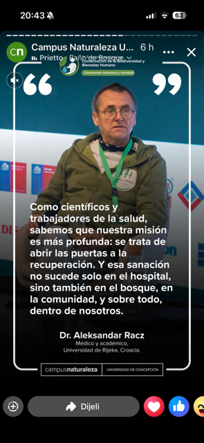 U razdoblju od rujna do listopada 2025. godine, izv. prof. dr. sc. Aleksandar Racz i dr. sc. biomed. Ljerka Armano, RN iz KBC Sestre Milosrdnice, kao pioniri Šumske terapije i Šumske medicine u Hrvatskoj, ujedno i suosnivači neprofitnog ForrestMind Instituta – sudjelovali su kao key note odnosno pozvani predavači te bili aktivni sudionici na tri iznimno značajna međunarodna događaja koji su obilježili svjetsku znanstvenu i stručnu scenu šumske terapije, integrativne medicine i bihevioralne ekologije: 7. Kongres Međunarodnog društva za šumsku terapiju (ISFT) – Waren an der Müritz, Njemačka, 1. Međunarodni forum o očuvanju bioraznolikosti i ljudskoj dobrobiti – Concepción, Čile, 2. Svjetski forum o šumskoj terapiji (WFOFT) – Cheongju / Jeju, Republika Koreja.