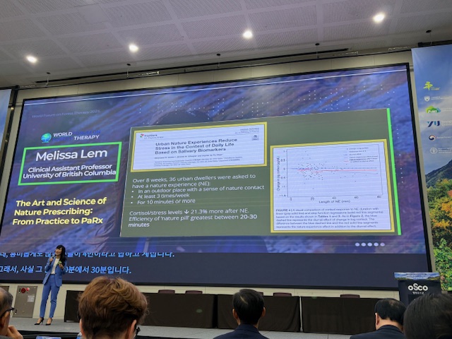 Treće veliko međunarodno predstavljanje uslijedilo je na 2nd World Forum on Forest Therapy (WFOFT) u Cheongju i Jeju, Republici Koreji, ponovno sudjelovali kao pozvani predavači (invited speakers) među najvećim svjetskim imenima, uključujući prof. Won Sop Shina, bivšeg ministra šumarstva Republike Koreje i utemeljitelja Svjetskog foruma o šumskoj terapiji.Forum je okupio znanstvenike, praktičare i donositelje politika iz više od 35 zemalja, a hrvatski doprinos istaknut je kroz interdisciplinarni pristup koji povezuje znanost, javno zdravstvo, ekologiju i edukaciju.